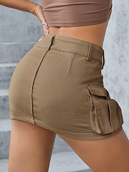 Women's Low Waist Button Bodycon Mini Cargo Denim Skirt with Pocket