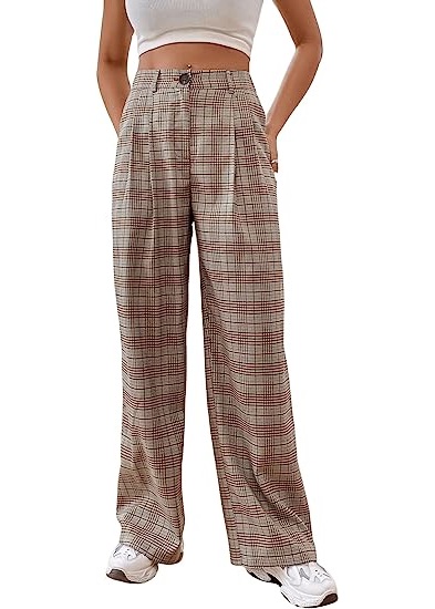 Women's Casual Plaid Print Pants High Waist Wide Leg Pleated Trouser Pants